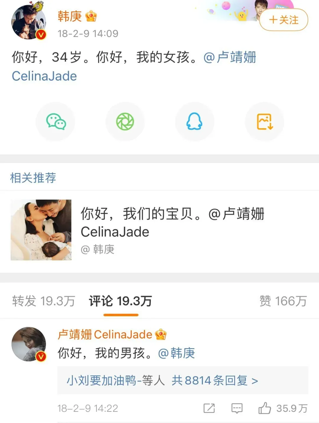 今年5月4日,卢靖姗与韩庚正式宣布怀上二胎,晒出一家三口手捧B超照片的合影,配文“咔嚓!一家四口的第一张合影”,韩庚转发称“我们又升级啦”。卢靖姗曾表示“兄弟姐妹是父母给孩子最好的礼物”,二胎为家庭规划。