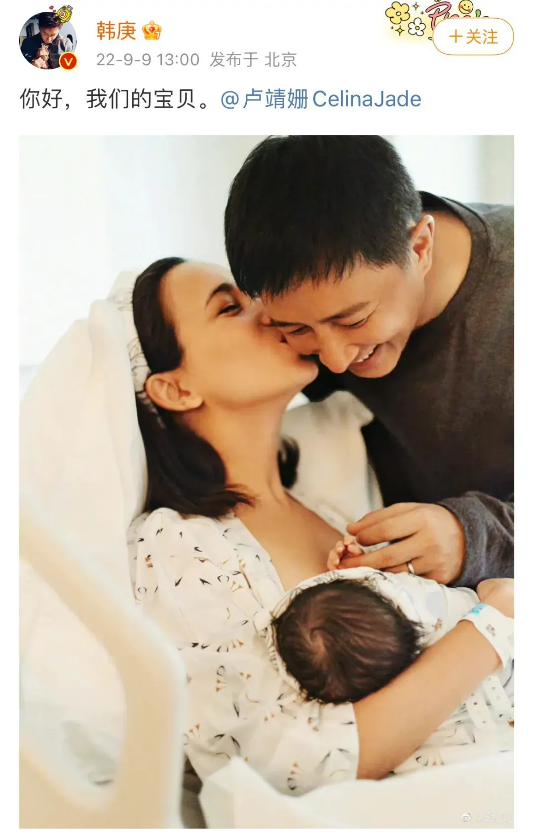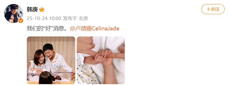 据看看新闻Knews:10月24日富豪优配,韩庚、卢靖姗夫妇在个人社媒同步晒出一家四口合照、牵手照,并配文:“我们的‘好’消息”,官宣二胎出生。